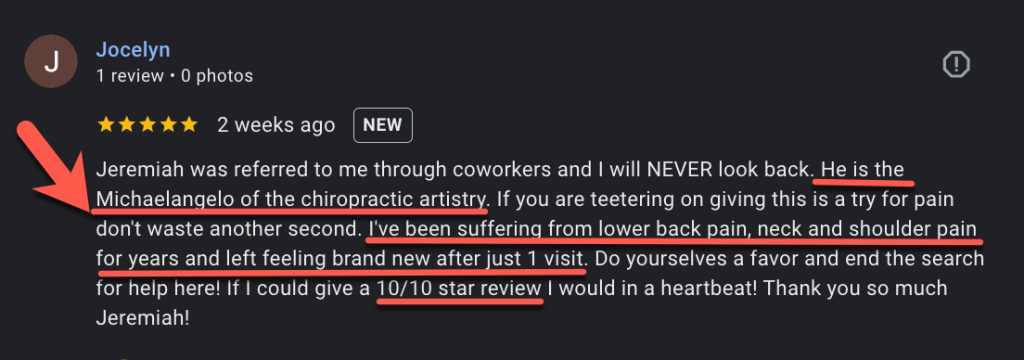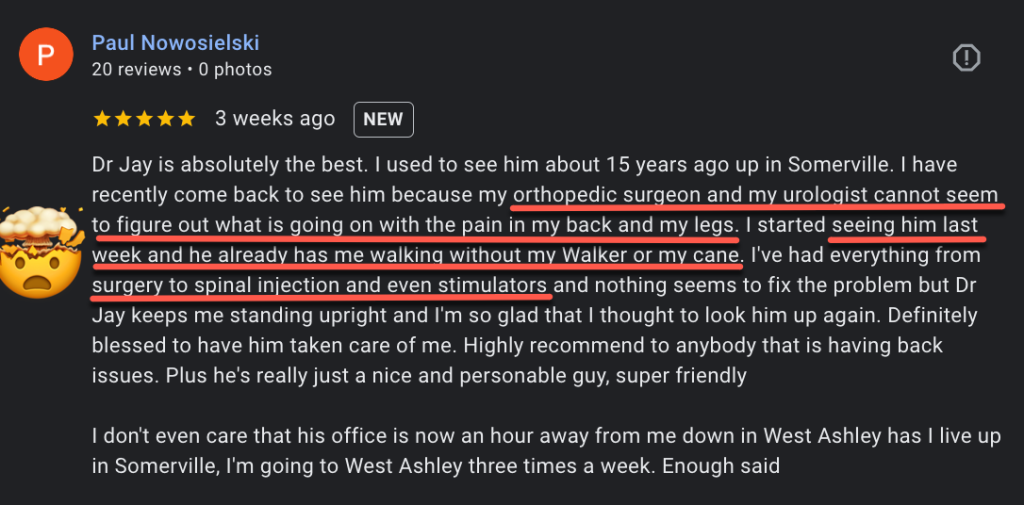 When you’re looking through reviews, pay attention to more than just the stars. In my practice, we’ve earned over 300 five-star reviews, but what’s most important is the stories behind them. Many of my patients have been through it all—surgeries, injections, multiple chiropractors and physical therapists—and they often tell us they made more progress in one session here than they had in years elsewhere.