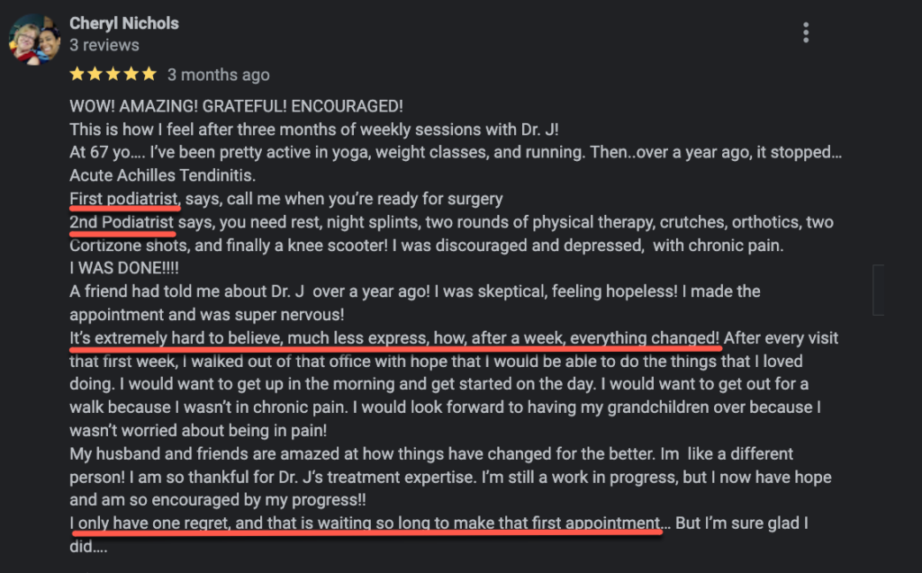 Her message to you and anyone else dealing with chronic ankle or other chronic pain issues? “Don’t wait like I did. I wish I found him sooner!”